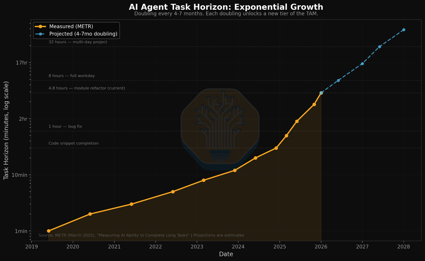 Source: METR / SemiAnalysis. AI agent task horizons are doubling every 4-7 months.